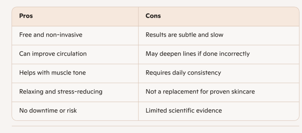 • Some evidence supports mild improvements in cheek fullness and facial muscle tone after consistent practice (about 20 weeks).