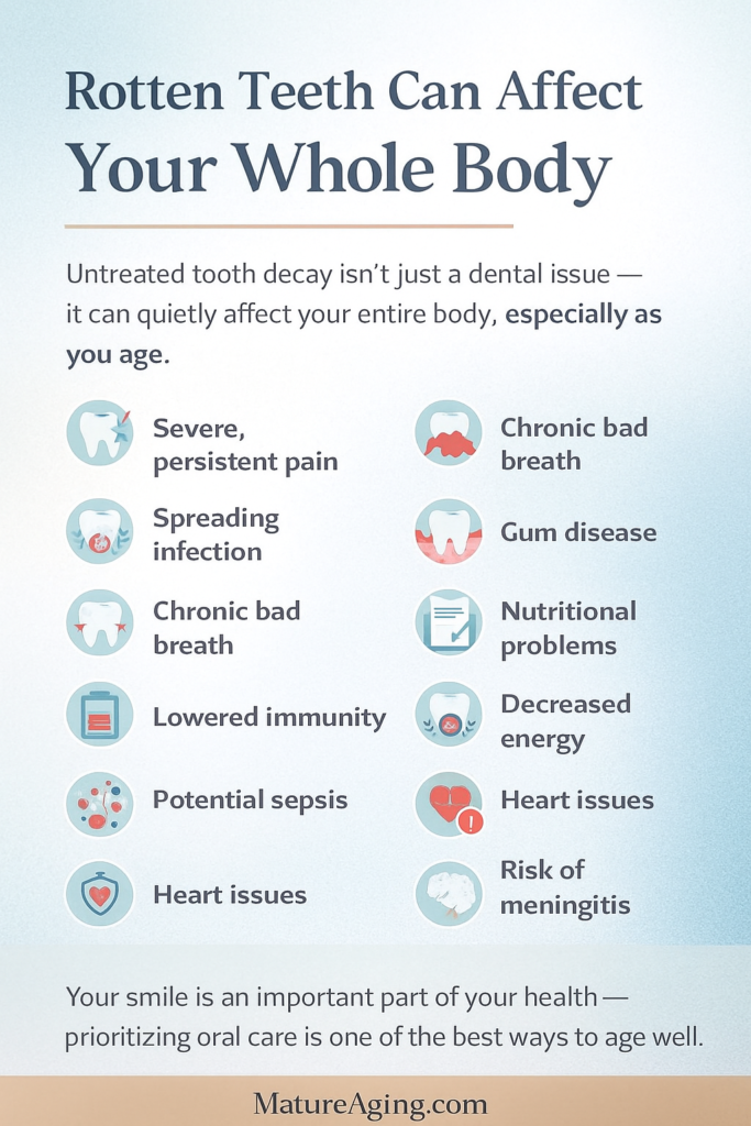 When most people think about tooth decay, they picture a cavity, a chipped tooth, or maybe a little sensitivity to cold drinks. But the truth is far more serious — especially for older adults. Rotten teeth don’t just affect your smile; they can quietly influence your entire body in ways many people never expect.